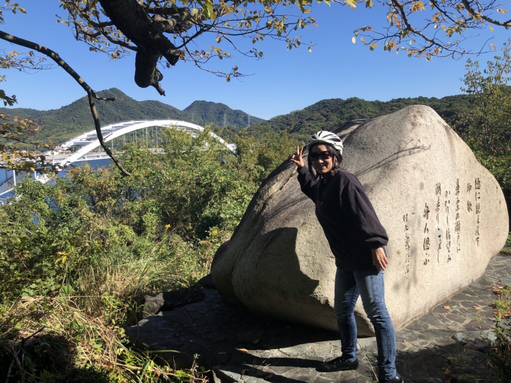 そのあとは大三島へ。道の駅多々羅しまなみ公園に行き、自転車を借りて島を散策する。10月の平日ということもあってか、人っ子一人いない。大きな工場から「カーン、カーン」という音がしていているのに、誰もいなさすぎて怖くなってくる。私達以外は青い海と青い空だけ。こんな環境に慣れていないので、異世界に迷い込んでしまったのかと錯覚するくらい。名前が面白いというだけで鼻栗瀬戸展望台を目的地にした私達は、異世界の中ひたすら自転車をこぐ。そして鼻栗瀬戸展望台は小さな山の上にあるのに、電動自転車が一台しか借りられなかった私達。上り坂でただのお荷物と化した自転車を、降りて手で押していく。なんのための自転車よ!そんな苦労をして辿りついた展望台からの景色はまあまあだった。